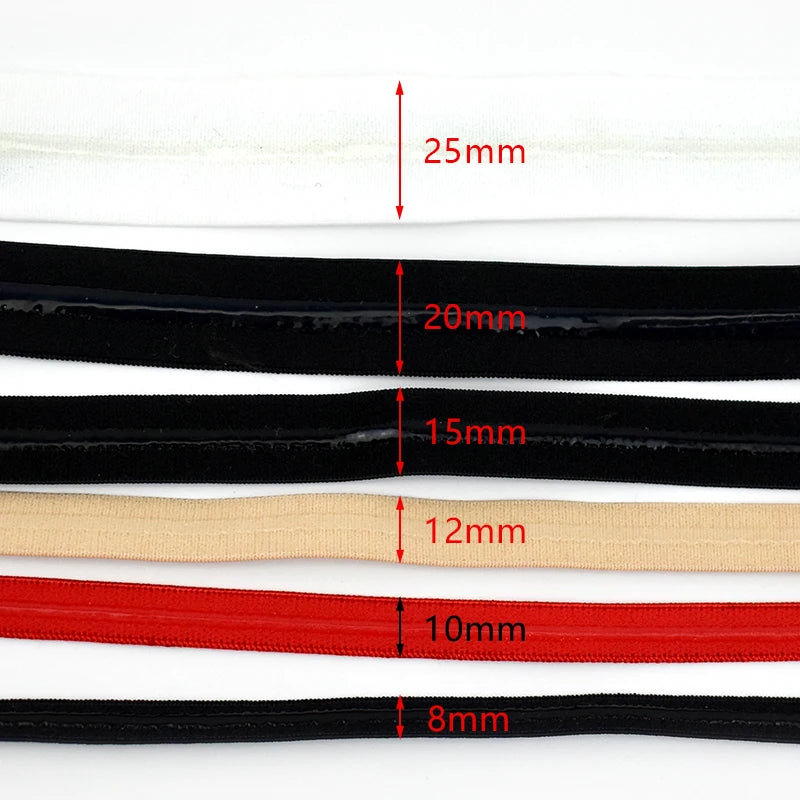 This specialized bra elastic features a silicone non-slip strip running down the center on the inside, preventing straps from sliding off shoulders. Available in 5-meter or 10-meter rolls and widths from 8mm to 25mm. Perfect for bra shoulder straps, lingerie construction, and any garment requiring secure, stay-in-place elastic. Available in red and flesh pink colors. The silicone grip strip keeps straps securely positioned while the elastic provides excellent stretch and recovery. Essential supplies for our fashion academy's lingerie workshops.