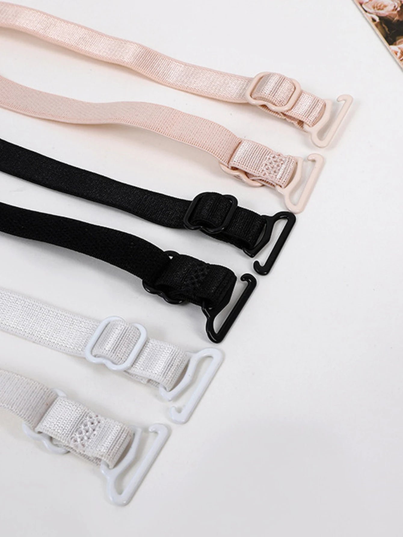 These adjustable lace bra straps feature delicate embroidered flower designs, perfect for replacing plain straps or adding a sexy, decorative element to lingerie. Each pack contains 3 pairs (6 straps total) in matching designs. The adjustable length ensures a perfect fit. Available in multiple styles (A, B, C, D, E) with different lace patterns. Ideal for upgrading existing bras, matching with special lingerie, or creating custom bra designs. Essential accessories for our fashion academy's lingerie workshops.