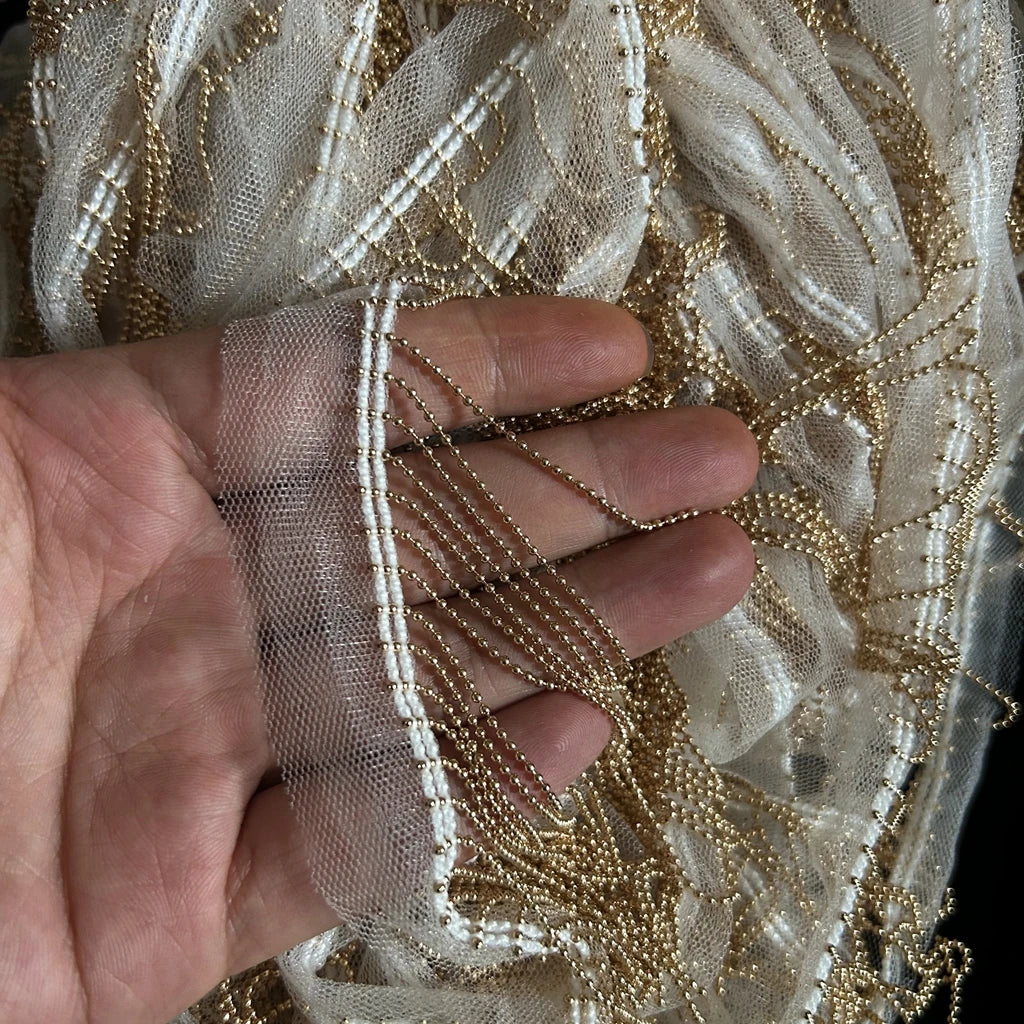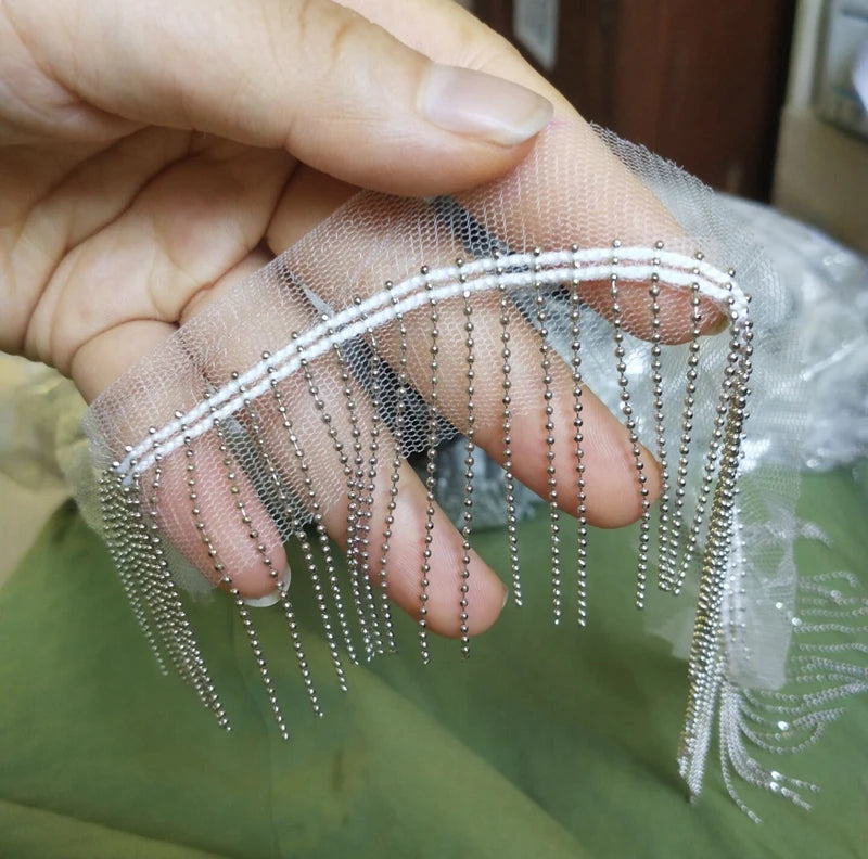 Stunning 1-yard metal chain beaded lace fringe - handmade tassel trim perfect for bags, jeans, shoes, and fashion accessories!